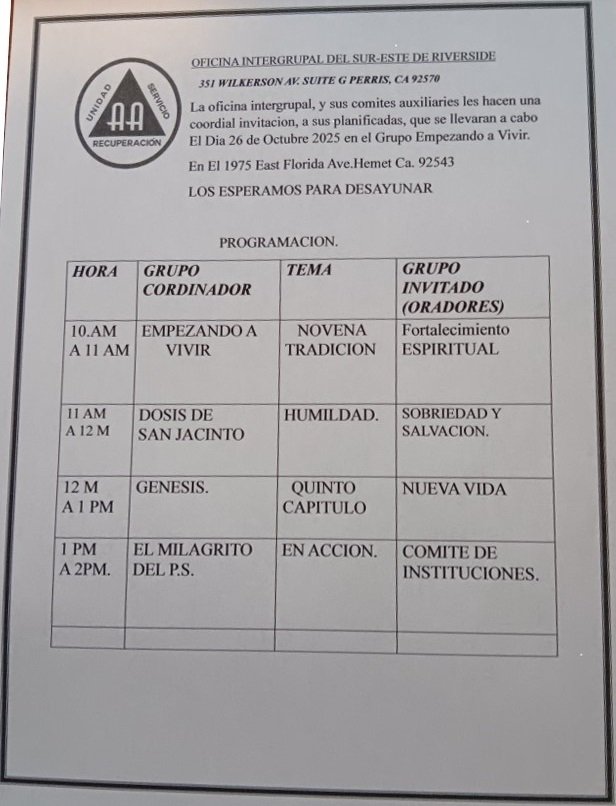 « All Events This event has passed. Oficina intergrupal Sureste Riverside Planificada 10/26/25 de 9:00am a 2:00pm October 26 @ 9:00 am - 2:00 pm VII CONGRESO REGIONAL DE AA OCTUBRE 31,1 Y 2 DE NOVIEMBRE DEL 2025 » Add to calendar Google Calendar iCalendar Outlook 365 Outlook Live Details Date: October 26 Time: 9:00 am - 2:00 pm